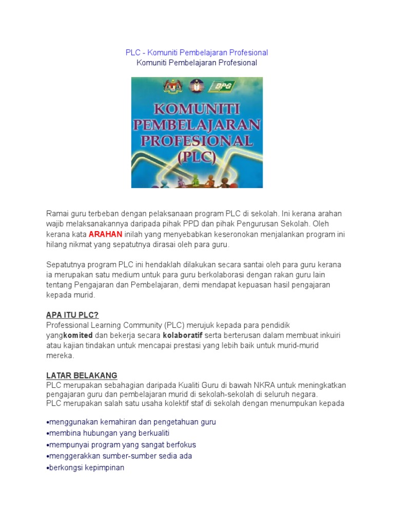 Cadangan dan sokongan semua pihak amat dialu-alukan bagi menjayakan PLC. This study illustrates how the process of implementing PLC Professional Learning Community in GagasCeria Elementary School located at Jalan Malabar No. Pelaksanaan Komuniti Pembelajaran Profesional PLC di Sekolah-sekolah Daerah Tumpat.